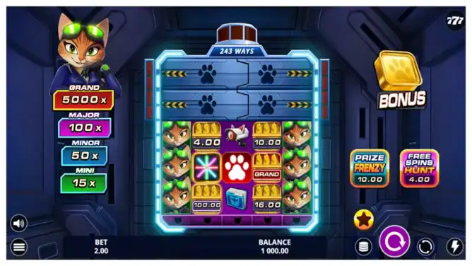 The game starts as a 5×3 slot but quickly adapts as Paw Symbols appear. Collecting Paws increases the number of rows up to 5 in the Base Game, modifying the Ways-to-Win count dramatically. Cash Symbols, Cash Adders, and Collect Symbols work together, with Collect serving as the key to awarding all Cash and Jackpot icons instantly.