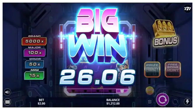 Jackpot levels range from Mini (15×) to Grand (5,000×), transforming certain spins into dramatic big-win moments. The Bonus Feature occasionally triggers on its own, awarding up to nine random prize values up to 2,500×.