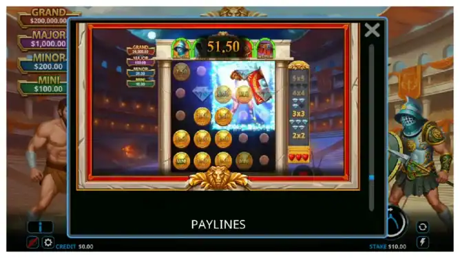 Julius Maximus: Legend of the Arena™ delivers a cinematic 5-reel, 20-payline adventure where strategy and spectacle collide. Its signature Hero-versus-Villain system fuels a dynamic Bonus Feature packed with grid expansions, Diamond gathers, and jackpots reaching 20,000× your stake. With a 96.00% RTP and an overall win potential of 25,000×, this slot combines rich atmosphere, refined mechanics, and high-stakes thrills for an unforgettable arena showdown.