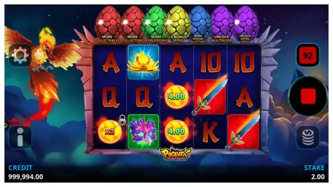 The Bonus Feature grants 10 Bonus Spins and introduces the Phoenix as a Collect symbol. Value symbols display cash amounts, while Special symbols may add multipliers or award Extra Spins. Whenever a Collect symbol appears, it gathers all visible values and applies any active multipliers, combining everything into one amplified payout. With multipliers stacking up to x10, a single spin can dramatically reshape the session.